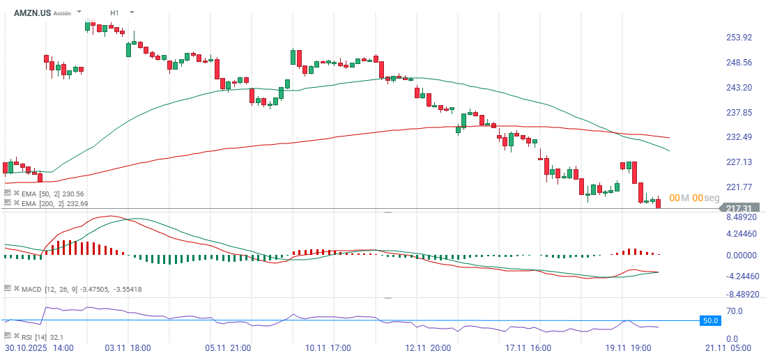 Hemos realizado un ejemplo de análisis técnico del activo Amazon (AMZN.US) en la plataforma XTB utilizando los indicadores EMA 50, EMA 200, RSI y MACD para el marco temporal diario (D1). A continuación, te presento los hallazgos y la interpretación de cada indicador: